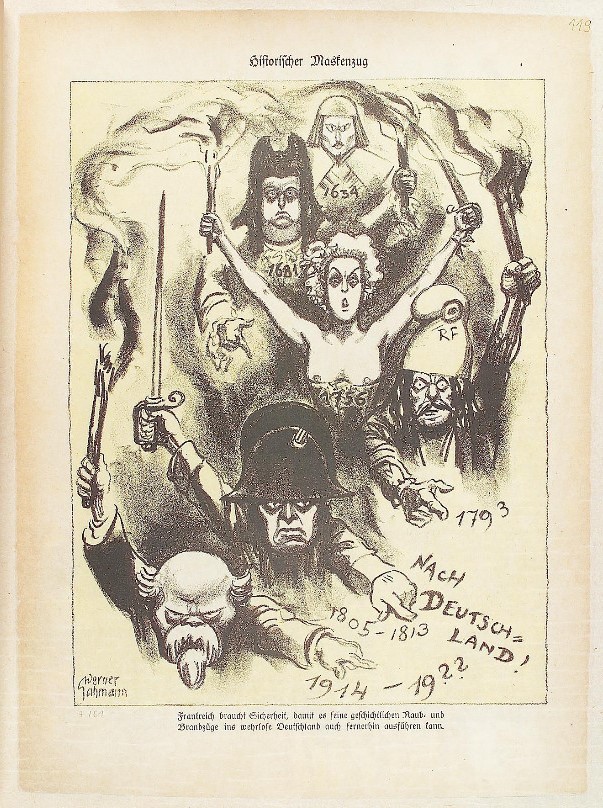 Diese Karikatur aus der Ausgabe der Satirezeitschrift Kladderadatsch vom 19. Februar 1928, die angesichts des Erscheinungsdatums ein Karnevalsthema hatte, stellte die französische Besetzung als einen weiteren in einer langen Reihe von historischen Versuchen dar, das Rheinland an Frankreich anzugliedern. Beginnend mit dem Dreißigjährigen Krieg (hier durch das Jahr 1634 repräsentiert, in dem Ludwig XIII. den Vertrag von Paris gegen Deutschland abschloss), über die Eingliederung Straßburgs durch Ludwig XIV im Jahr 1681, den Beginn des Siebenjährigen Krieges 1756, die Französische Revolution (1793) und die Napoleonischen Kriege (1805-1813) bis zum Ersten Weltkrieg wird Frankreich mit verschiedenen Masken dargestellt, die doch alle das gleiche Ziel verfolgen, nämlich nach Deutschland einzumarschieren. Die Bildunterschrift der Karikatur lautete: „Frankreich braucht Sicherheit, damit es seine geschichtlichen Raub- und Brandzüge ins wehrlose Deutschland auch fernerhin fortsetzen kann.“