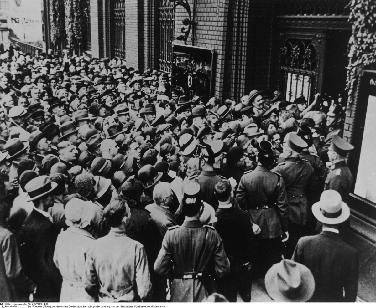 Andrang von Sparern vor der Sparkasse der Stadt Berlin am Mühlendamm (16. Juli 1931), veröffentlicht in: German History in Documents and Images, <https://germanhistorydocs.org/de/die-weimarer-republik-1918-1933/ghdi:image-4107> [16.03.2026].