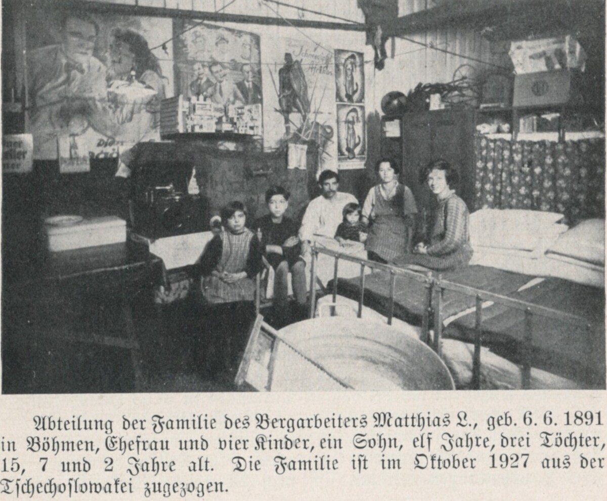 Dieses Bild wurde in einer Unterkunft für zugewanderte Bergarbeiter und ihre Familien in Oelsnitz im sächsischen Vogtland aufgenommen. Es zeigt die sechsköpfige Familie eines Bergarbeiters, die zwei Jahre zuvor aus der damaligen Tschechoslowakei eingewandert war. Die sechsköpfige Familie teilte sich zum Wohnen und Schlafen einen Raum in der Wohnbaracke, deren einzelne Wohneinheiten nur durch Metallschränke getrennt waren. Die Einwanderungspolitik der Weimarer Republik war sehr restriktiv, doch herrschte besonders in Industrie und Landwirtschaft ein akuter Arbeitskräftemangel, sodass Betriebe die Beschäftigung von ausländischen Arbeitskräften beantragen konnten, sofern keine inländischen Arbeitskräfte zur Verfügung standen. Die Mehrheit der Arbeitsmigranten stammten aus der Tschechoslowakei, Polen und Österreich. Für die Anwerbung und Vermittlung war die Reichsanstalt für Arbeitsvermittlung zuständig, die dabei eine inoffizielle Politik der vorrangigen Anwerbung deutschstämmiger Migranten verfolgte.