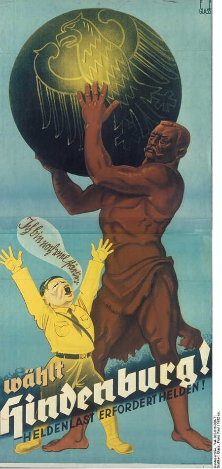 Zum Zeitpunkt der Reichspräsidentenwahl 1932 war Reichspräsident Paul von Hindenburg weit über 80 Jahre alt und längst nicht mehr bei guter Gesundheit. Dies hielt jedoch das Zentrum und die Rechte nicht davon ab, ihn als ein Symbol männlichen Heldenmuts und der Stabilität zu präsentieren – und als eine Verbindung zur vergangenen Ära des Deutschen Kaiserreiches. Hindenburg erhielt zudem breite Unterstützung durch die Sozialdemokraten, die in ihm die einzige Möglichkeit sahen, Hitler aufzuhalten, der ebenfalls kandidierte. Auf diesem Wahlplakat erscheint der gealterte ehemalige Kriegsheld als Atlas, der einen Globus trägt, auf dem der deutsche Reichsadler thront. Er lässt Hitler klein erscheinen, der neben ihm steht und ausruft: „Ich bin noch viel stärker.“