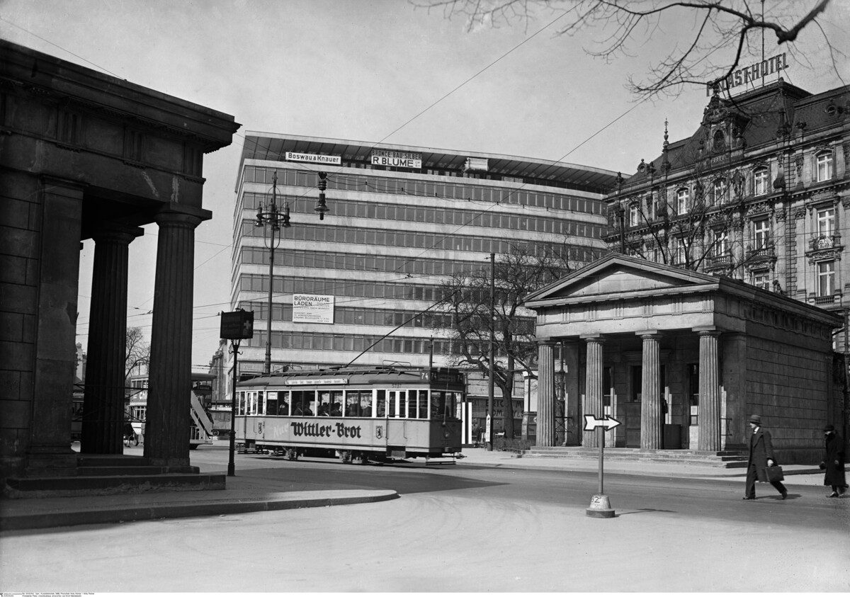 Quelle: Potsdamer Platz, Columbushaus, entworfen von Erich Mendelsohn, rechts das Palast-Hotel, 1932. Fotograf: Willy Römer.