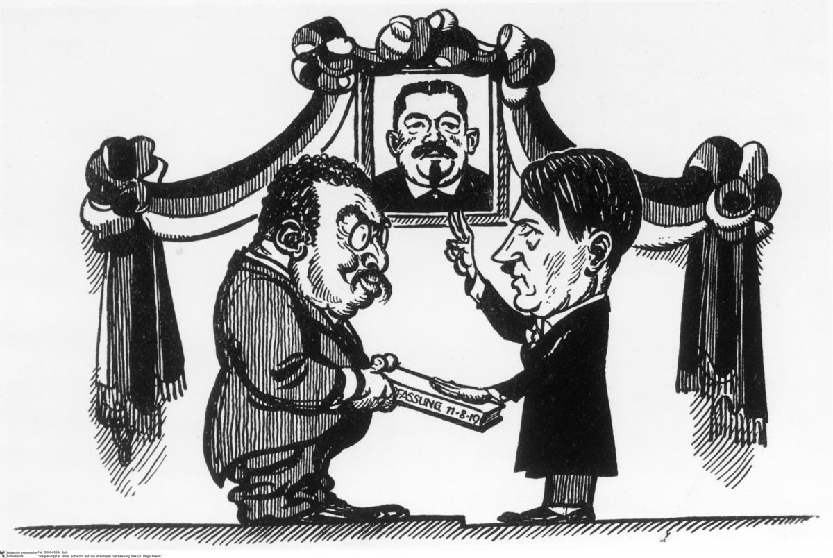 Am 25. Februar 1932 wurde Hitler zum Regierungsrat in der Braunschweiger Landesregierung ernannt. Es handelte sich um einen untergeordneten Posten, doch die Ernennung brachte die Verleihung der deutschen Staatsbürgerschaft mit sich, die ihn wiederum berechtigte, für die Wahl zum Reichspräsidenten zu kandidieren. Diese Karikatur zeigt Hitler, wie er den Einbürgerungseid ablegt und schwört, die Weimarer Verfassung aufrecht zu erhalten. Die Verfassung hält deren Hauptautor Hugo Preuß in den Händen, der hier mit den stereotypischen jüdischen Zügen dargestellt ist. Friedrich Ebert, der Sozialdemokrat, der von 1919 bis zu seinem Tod 1925 als erster Reichspräsident gedient hatte, beobachtet die Szene. Die Karikatur, die den Antisemitismus des Zeichners Anton Paul Weber offenkundig macht, erschien in der illustrierten nationalbolschewistischen Zeitschrift Der Widerstand.
