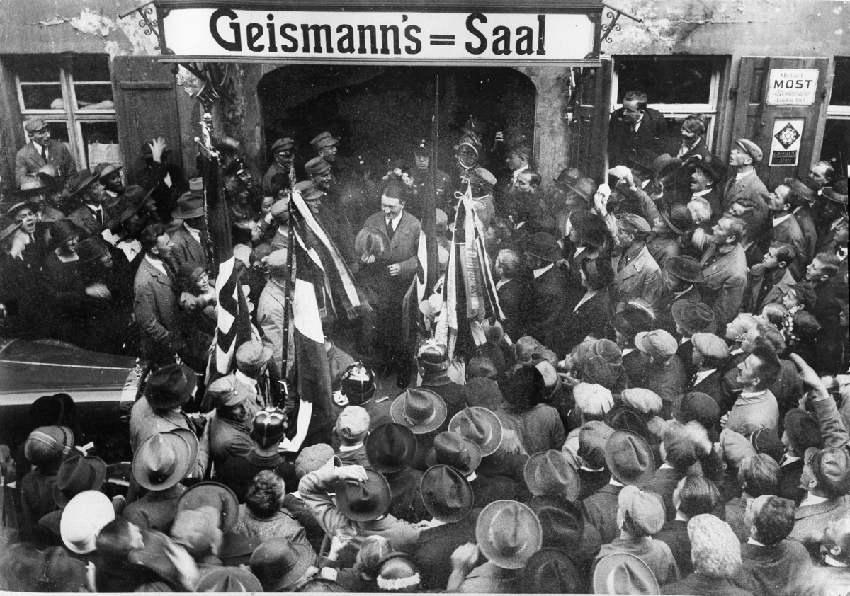 Der Veranstaltungssaal der Brauerei Geismann in der fränkischen Stadt Fürth existierte seit 1896. Da er der größte Veranstaltungsraum der Stadt war, wurde er häufig für Konzerte, Feste und politische Versammlungen genutzt. Dieses 1926 entstandene Foto von Heinrich Hoffmann, der die Aktivitäten der NSDAP dokumentierte und Hitlers persönlicher Fotograf wurde, zeigt Hitler in Zivil gekleidet beim Verlassen einer Veranstaltung im Geismann-Saal. Hitler, der im Dezember 1924 vorzeitig aus der Haft entlassen worden war und im Februar 1925 die zuvor verbotene NSDAP neugegründet hatte, war zu diesem Zeitpunkt noch mit einem öffentlichen Redeverbot in Bayern belegt, sodass er während der Veranstaltung nicht als Redner auftreten konnte. Die Menge seiner Anhänger, die ihn vor dem Lokal begrüßen, weist jedoch darauf hin, dass er insbesondere in Bayern nach wie vor populär war. In Franken profitierte die NSDAP besonders von der Agitation des antisemitischen, rechtsextremen Verlegers Julius Streicher, der seit 1922 Parteimitglied war und ab 1923 die Propagandazeitung Der Stürmer herausgab.