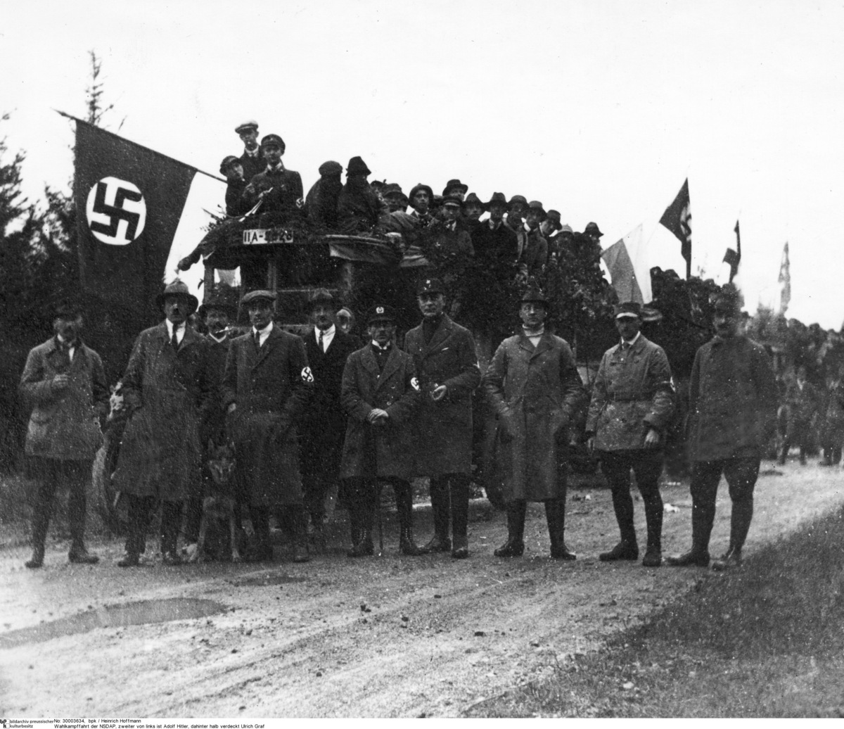 Die Nationalsozialistische Deutsche Arbeiterpartei (NSDAP) wurde im Februar 1920 gegründet, dem Jahr, in dem dieses Foto aufgenommen wurde. Zu diesem Zeitpunkt hatte Hitler bereits das 25-Punkte-Programm der Partei verfasst, er wurde jedoch erst 1921 Parteivorsitzender. Auf diesem Bild ist Hitler (Zweiter von links) in Zivilkleidung zu sehen, wie er mit mehreren anderen Parteimitgliedern während einer Wahlkampfveranstaltung (wahrscheinlich in der Nähe von München, wo die Partei gegründet wurde) für die Kamera posiert. Im Juni 1920 fanden sowohl Reichstags- als auch bayerische Landtagswahlen statt, so dass diese Wahlkampfveranstaltung organisiert wurde, um sowohl auf Landes- als auch auf Reichsebene um Unterstützung zu werben. Die überwiegend männlichen Parteianhänger auf diesem Bild fahren auf Lastwagen und schwenken sowohl das Hakenkreuzbanner der NSDAP als auch andere Fahnen. Die NSDAP war jedoch bei keiner der beiden Wahlen 1920 erfolgreich und gewann erst mit dem Beginn der Wirtschaftskrise an Boden. Das Foto wurde von Heinrich Hoffmann aufgenommen, der später Hitlers persönlicher Fotograf wurde.