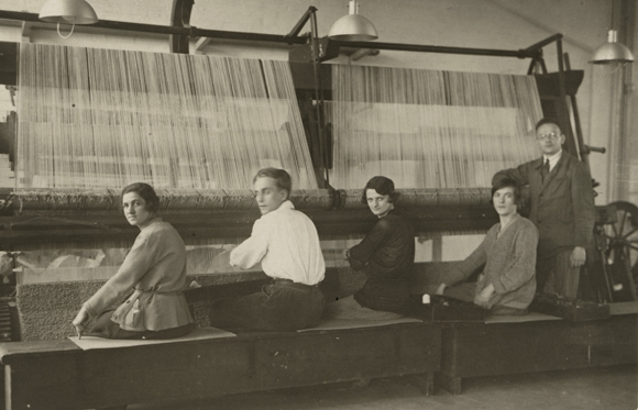 Die Mehrheit der Studierenden in der Weberei-Werkstatt am Bauhaus waren von Anfang an Frauen. In den meisten Fällen teilte die Schulverwaltung sie bei der Einschreibung der Weberei-Werkstatt zu. Während sie in vieler Hinsicht progressiv waren, betrachteten die ausschließlich männlichen Gründer des Bauhauses Weberei und andere Formen der Textilkunst als Frauendomäne. Die Weberei-Werkstatt wurde von dem Maler und Grafiker Georg Muche bis zu dessen Weggang 1927 geleitet, woraufhin Gunta Stölzl als erste und einzige Frau zur Bauhaus-Meisterin ernannt wurde. Die in der Werkstatt entworfenen gewebten Textilien wurden als Teppiche, Wandbehänge und Möbelbezugsstoffe in die Bauprojekte integriert. Nach dem Umzug nach Dessau richtete die Werkstatt eine eigene Färberei ein und begann mit Industrietextilien zu experimentieren. Dieses Foto zeigt vier Studierende an den Webrahmen der Werkstatt mit Kurt Wanke (stehend), dem Werkmeister von 1925-1932.