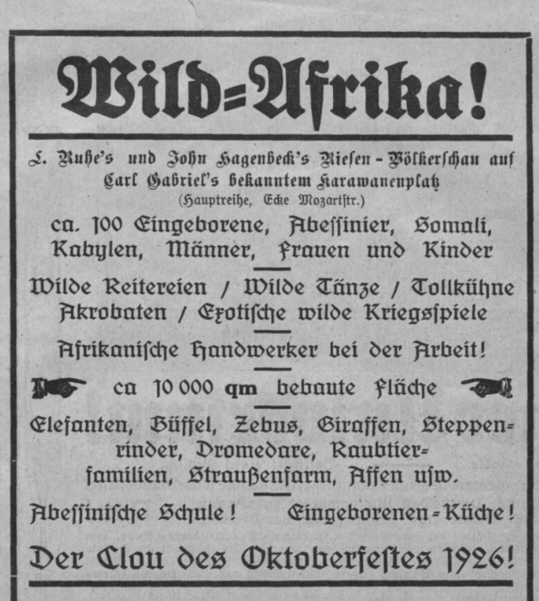 Diese Werbung für eine „Wild-Afrika“-Ausstellung auf dem Münchner Oktoberfest 1926 griff die Faszination des Publikums für die Menschen und die Tiere Afrikas auf. Das Adjektiv „wild“ wurde viermal verwendet, um die ethnologische Vielfalt der ausgestellten Tiere hervorzuheben und sogar einen Hauch von Erotik in Verbindung mit „wilden Tänzen“ zu suggerieren. Exotisierte schwarze Körper waren in Europa nicht nur in Völkerschauen, sondern auch in anderen Kontexten wie Musikveranstaltungen präsent.