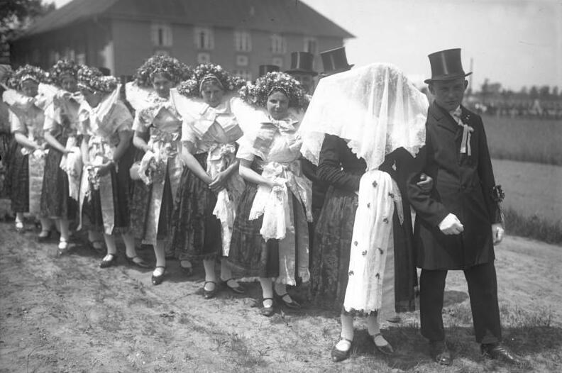Quelle: Wenden-Hochzeit im Spreewald, April 1931. Foto: Georg Pahl. Bundesarchiv Bild 102-11632. wikimedia commons: https://commons.wikimedia.org/wiki/File:Bundesarchiv_Bild_102-11632,_Spreewald,_Wenden-Hochzeit.jpg