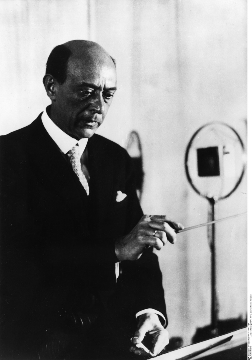 Austrian born Arnold Schönberg (1874-1951) was one of the major composers of the 20th century. His dodecaphonic method of composition, also known as twelve-tone serialism, is one of the landmarks of musical modernism and was taken up by many of his students, most prominently Anton Webern and Alban Berg. Schönberg was a harsh critic of radio and worried that the coarse, fuzzy sound of radio music would become standard and that the beautiful tones of various instruments would be lost. Despite his misgivings, he accepted a 1927 invitation to conduct his own works for the Berlin Radio Hour [Funk-Stunde Berlin], the first public radio broadcaster in Germany. After the National Socialist takeover in 1933, Schönberg, who had experienced discrimination because of his Jewish roots, emigrated to the United States.