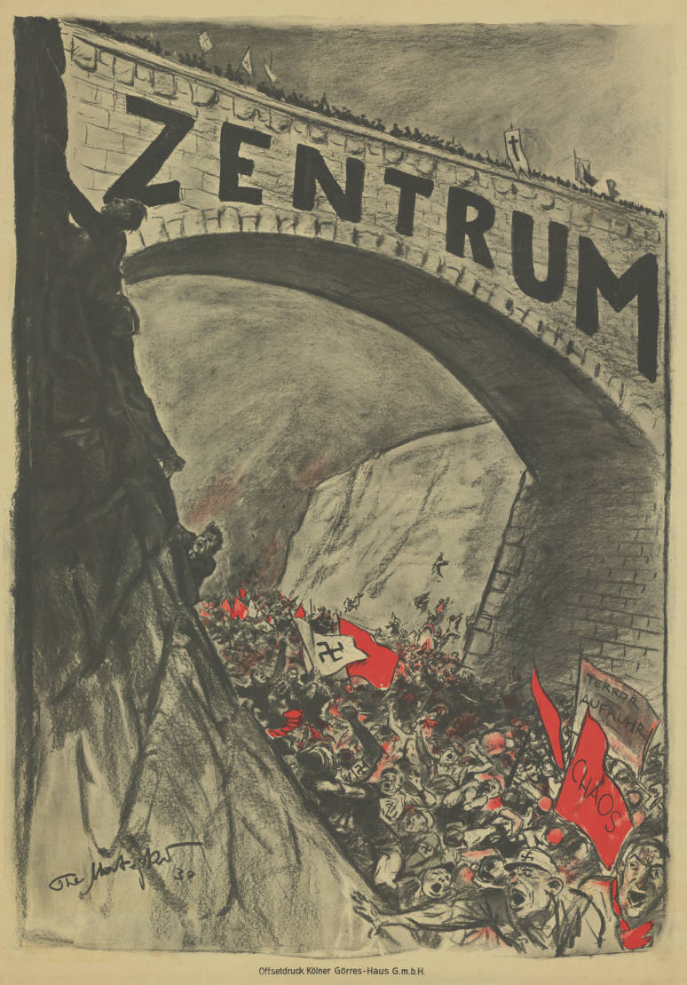 Since its founding in 1870, the Center party represented the interests of political Catholicism across all strata of German society. While it rejected revolution as a political means, it did embrace the Republic and its constitution. Along with the SPD and the DDP, it formed the Weimar Coalition, and it was part of every government until 1932, forging alliances with parties across the political spectrum. The political orientation of the five Zentrum politicians who served as Reich Chancellor (Fehrenbach, Wirth, Marx, Brüning, and von Papen) also differed significantly. This election poster from the campaign for the 1930 Reichstag election depicts the Zentrum party as a bridge, leading its followers across the political abyss under the banner of Catholicism. Down in the chasm, “chaos, terror, and turmoil,” personified by the followers of the extreme left and right-wing parties (who are identified by the red flag and the swastika respectively), try to forge ahead. In the end, it was the KPD and especially the NSDAP, however, who emerged as the winners of the 1930 election.