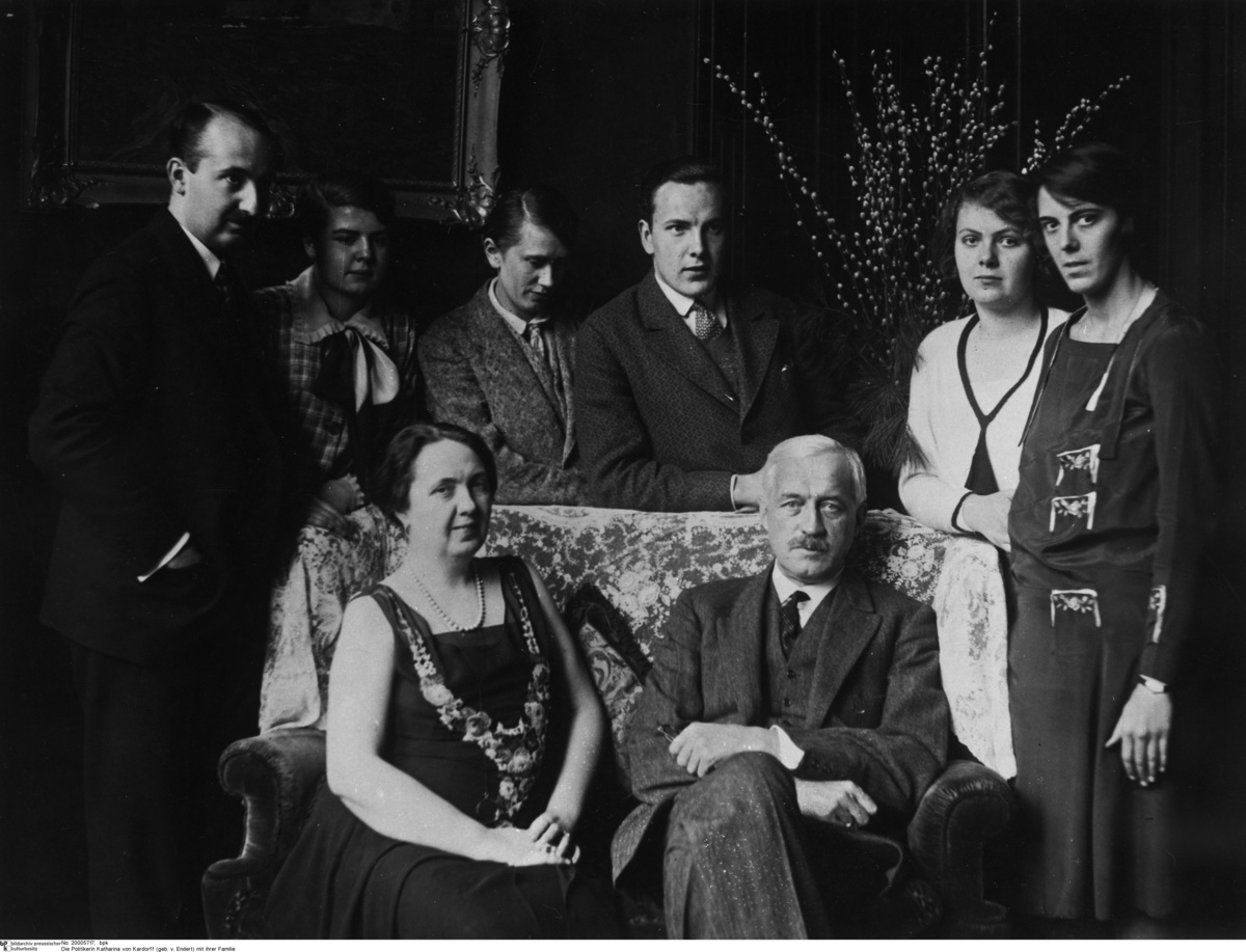 Katharina von Kardorff-Oheimb (1879-1962) was one of the first women elected to the Reichstag. From 1920 to 1924, she represented the German People’s Party [Deutsche Volkspartei or DVP] in the first Reichstag of the Weimar Republic. She was also a celebrated Berlin hostess, whose Kurfürstendamm home was the venue for influential and popular salons the 1920s. Her fourth husband, Siegfried von Kardorff (1873-1945), whom she married in 1927, was a fellow member of the conservative DVP. He served in the Prussian Parliament [Landtag] and later as vice president of the Reichstag (1928-32). Their story is interesting – not least because it illustrates that, within certain upper-class circles, liberal views of marriage and family sometimes mixed with political conservatism. This 1929 photo shows the couple with Katharina von Kardorff's six children from her previous marriages.