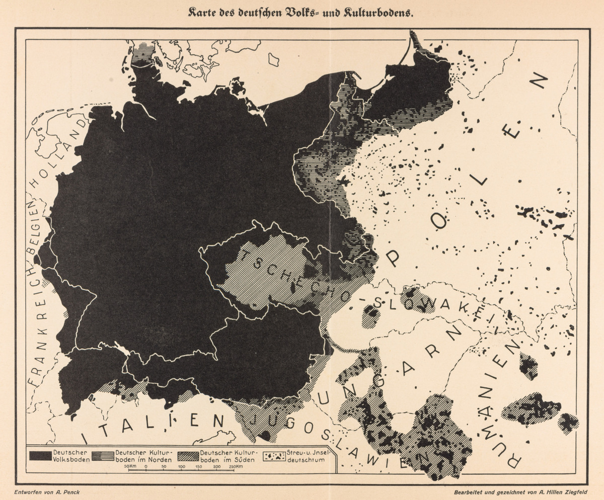 The author of this particular map, the geographer Albrecht Penck, had established a reputation prior to the First World War as one of the world’s leading researchers in climatology, glaciation, and the study more broadly of how physical features manifest the underlying geological conditions. During and after the war, however, Penck grew increasingly interested in studying Germany’s ethnic and cultural presence throughout central Europe. His ideas attracted conservative nationalists and, later, National Socialists, who drew on Penck’s writings to justify their own calls for Germany’s territorial expansion throughout central Europe.