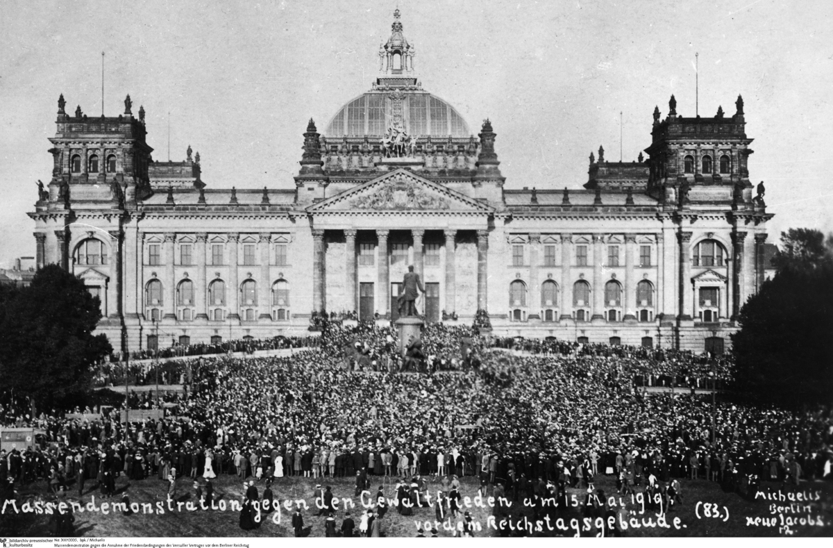 The conditions of the Treaty of Versailles met with harsh protest in Germany, from both the government and the population alike. All parties summarily rejected the territorial transfers in the west and east, as well as the reparations payments, which were regarded as excessively high. The strongest criticism, however, was reserved for the “War Guilt Clause,” which laid the blame for the war solely on Germany. Demonstrations leading up to the conclusion of the treaty sought to prevent Germany's leadership from accepting the harsh peace. In the face catastrophic food shortages and the helpless state of the military, however, the coalition government of the Social Democratic and Center parties saw no alternative to signing it. The radical right subsequently used the Treaty of Versailles as an excuse for nationalist agitation.