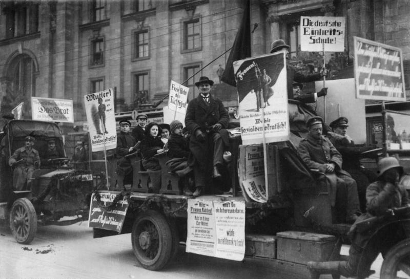 Source: Social Democratic election campaign in Berlin, January 1919, photographer: Gebrüder Haeckel. BA, collection of repro negatives, Bild Nr. 146-1972-033-15, available online on Wikimedia Commons: https://commons.wikimedia.org/wiki/File:Bundesarchiv_Bild_146-1972-033-15,_Berlin,_SPD-Wahlpropaganda.jpg