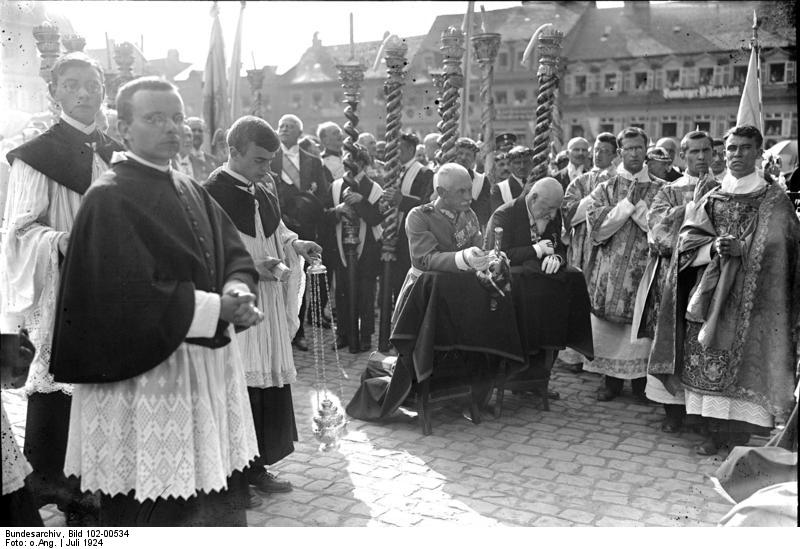 A large Catholic procession took place to celebrate the 900th anniversary of the town of Bamberg, in Upper Franconia in the northern part of Bavaria, in July 1924. In attendance were the papal nuncio Eugenio Pacelli (the future Pope Pius XII), all the archbishops of Germany and numerous other church dignitaries, as well as the former Crown Prince Rupprecht of Bavaria and the former Tsar Ferdinand of Bulgaria. Pacelli had been nuncio—the Vatican’s ambassador to Germany—since 1920. In March 1924, he had negotiated a concordat (a state-church treaty) between the Vatican and the Free State of Bavaria, which regulated the relationship between the state and the Catholic Church after the end of the monarchy. The concordat granted the Catholic Church extensive rights with regard to school and university education and secured its funding through a church tax. In this photo by the press photographer Georg Pahl, Rupprecht of Bavaria (kneeling left) and Ferdinand of Bulgaria (kneeling right) attend the public prayer service in Bamberg. Rupprecht of Bavaria, a member of the Wittelsbach dynasty whose kings had also been the sovereigns of the Catholic Church in Bavaria before the November 1918 Revolution, rejected the republic and hoped for the restoration of the monarchy in Bavaria. Ferdinand of Bulgaria, meanwhile, had abdicated after Bulgaria’s defeat in 1918—Bulgaria had been a member of the Central Powers, in alliance with Germany and Austria-Hungary— and subsequently lived in exile in Coburg, just 30 miles north of Bamberg. Public events like this one demonstrated how strong the influence of the Church and the respect for abdicated monarchs remained in many parts of Germany throughout the Weimar Republic.