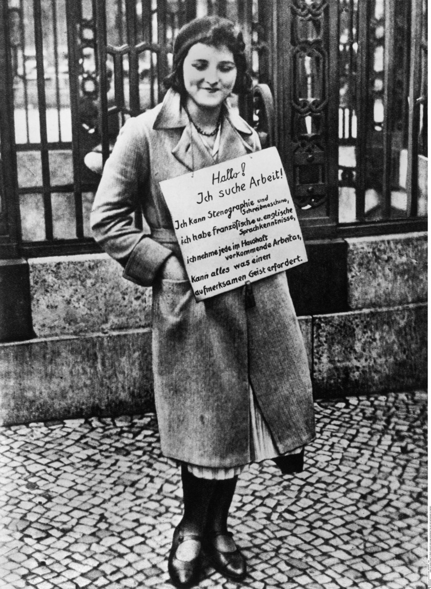 The photograph below features a young unemployed stenotypist in search of office work. The sign around her neck reads: