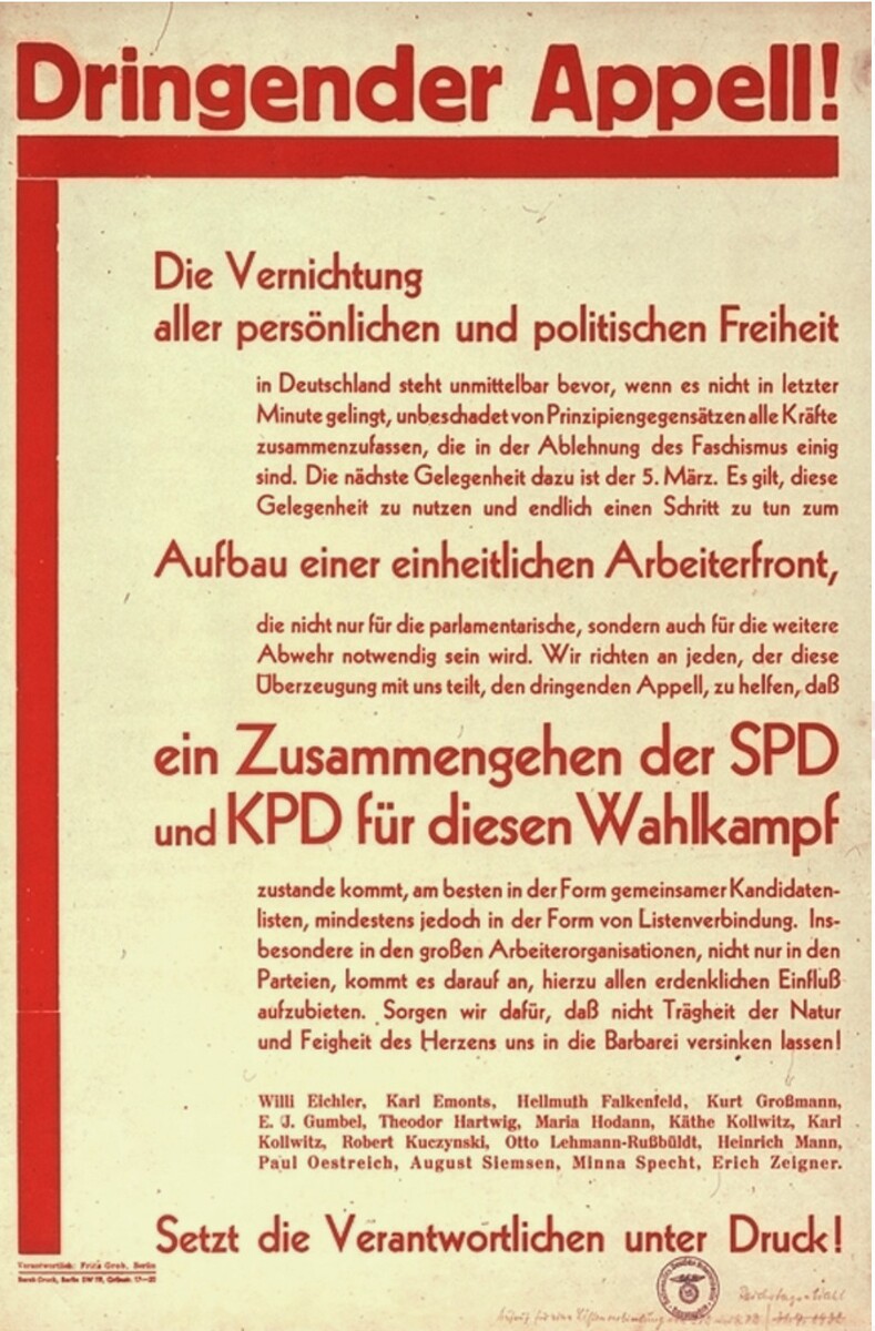 Urgent Appeal! The annihilation of all personal and political freedom Building a united labor front, Coalesce around the SPD and KPD in this election,